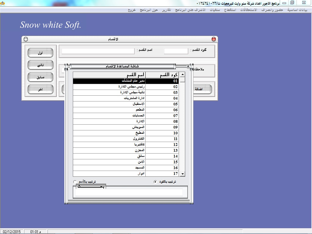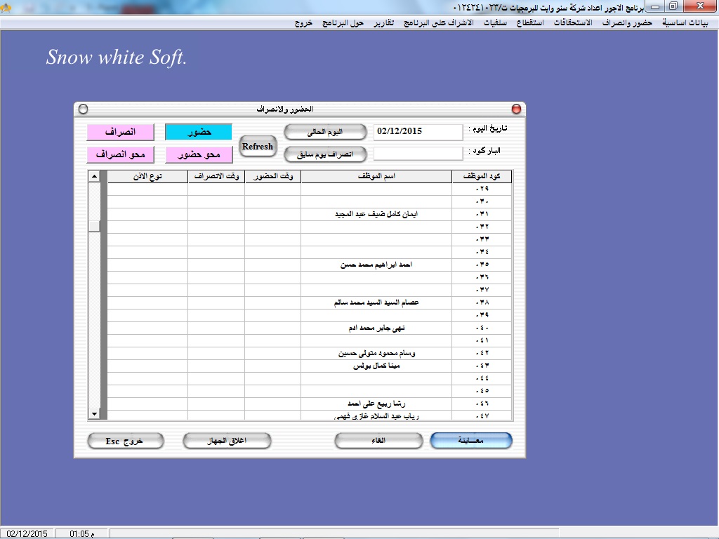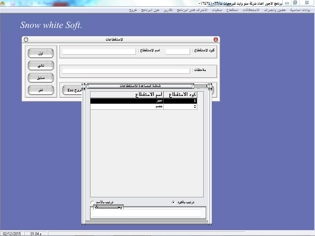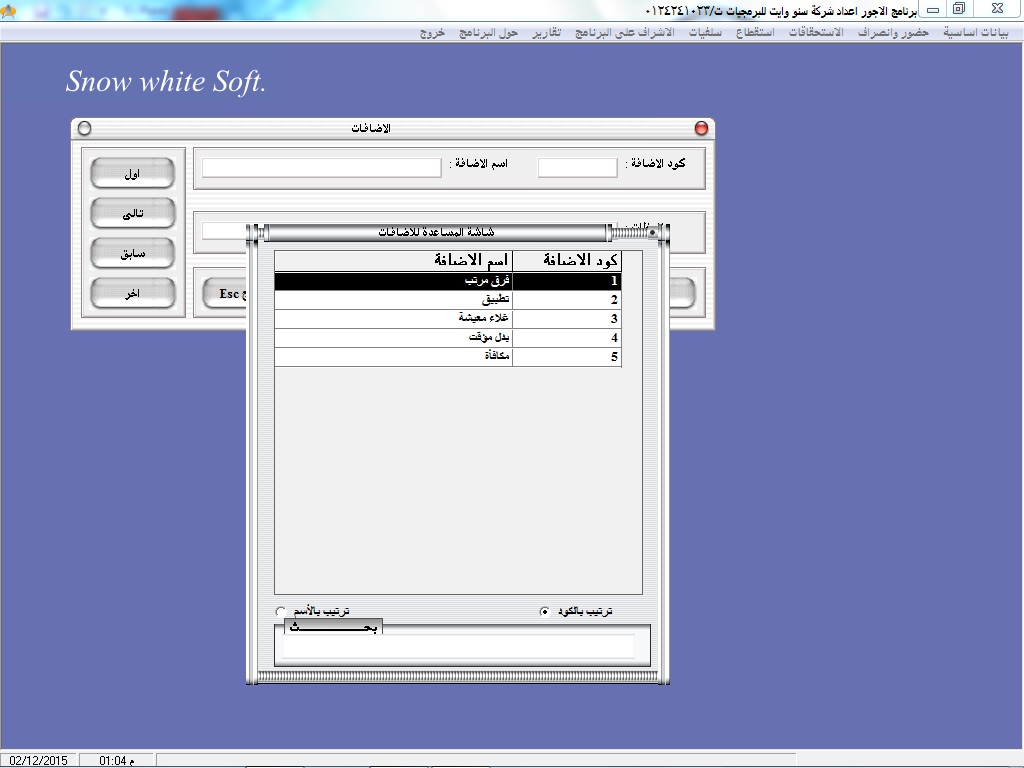 • سهولة البحث عن أكواد ا وأسماء العاملين عن طريق نظام مساعدة خاص بالبرنامج سهل الاستخدام