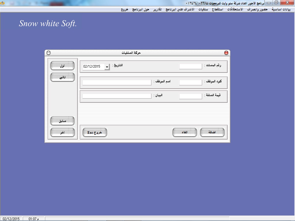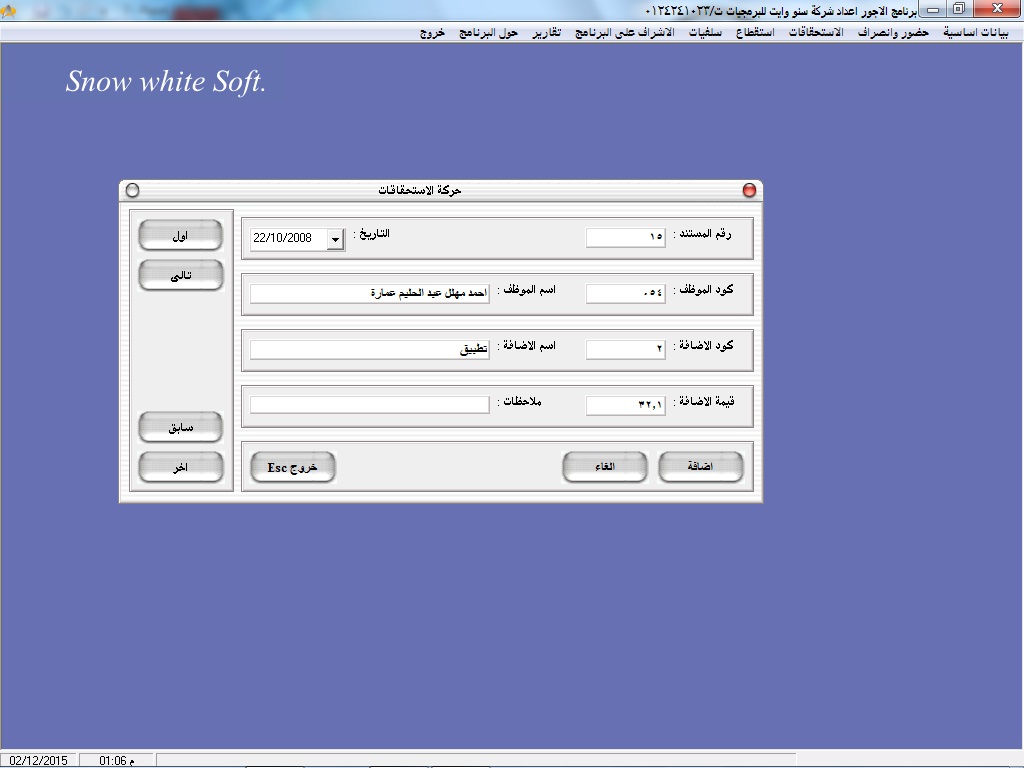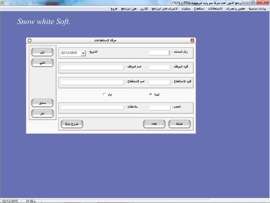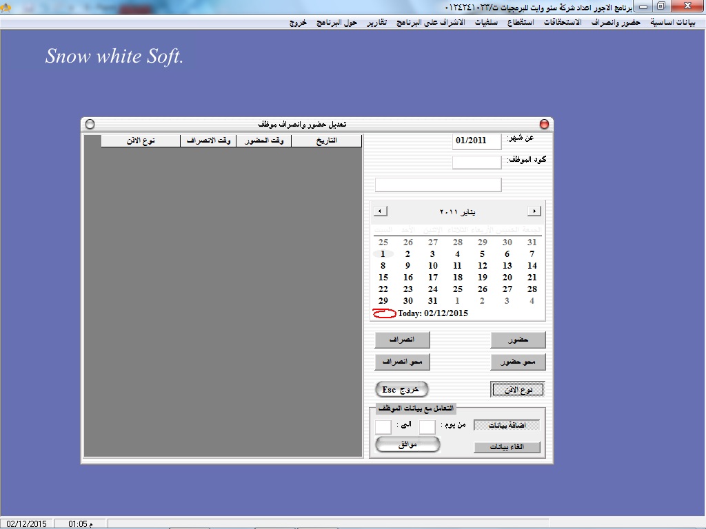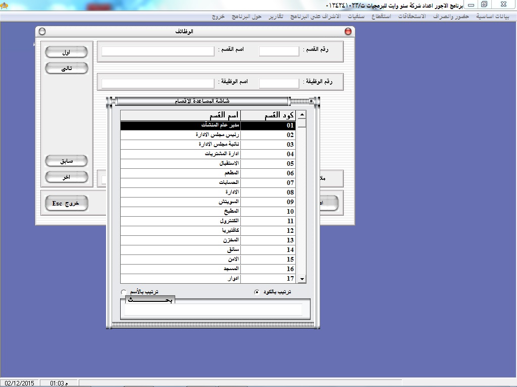 • سهولة البحث عن أكواد ا وأسماء العاملين عن طريق نظام مساعدة خاص بالبرنامج سهل الاستخدام
