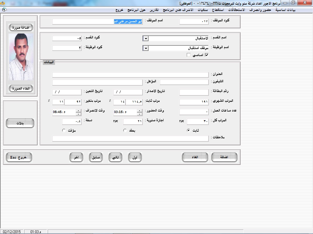 • بطاقة عمل لكل موظف على حده تتضمن كافة بياناته (الاسم، السن، العنوان، صورة شخصيه، المؤهل، الحالة الاجتماعية، الوظيفة الحالية)